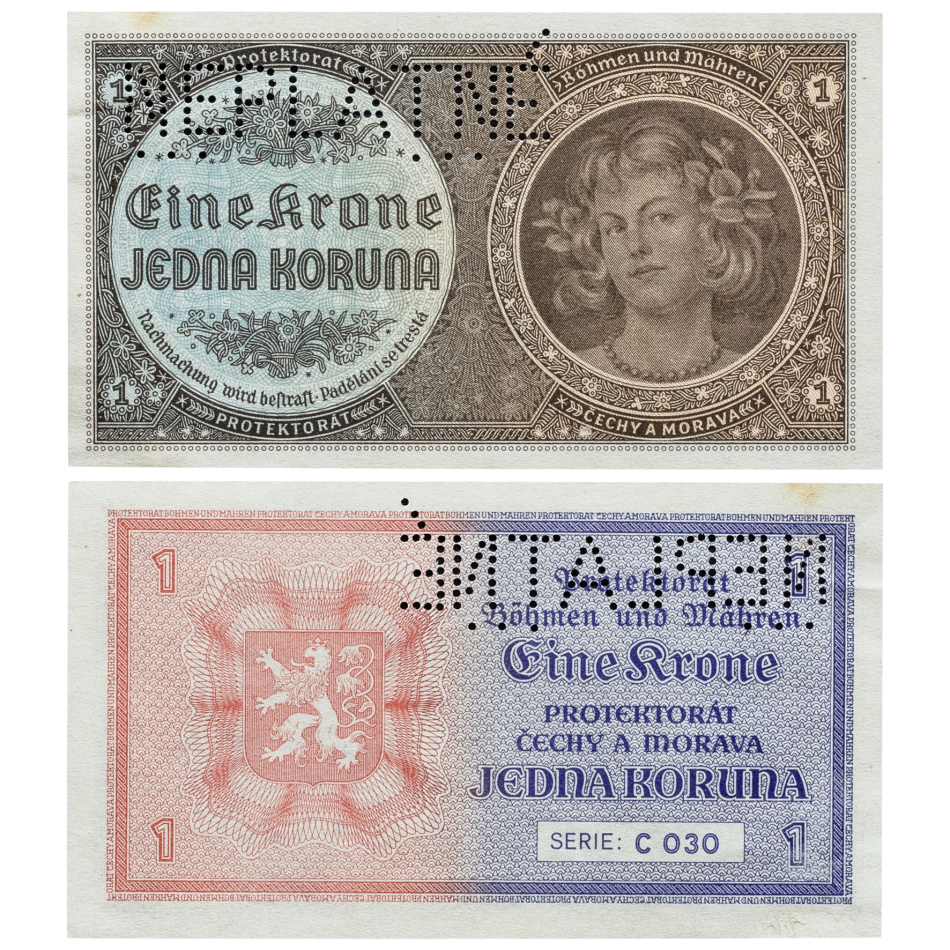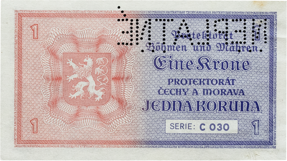 1 koruna bez data (1940), série C 030, perforace NEPLATNÉ, original foto.