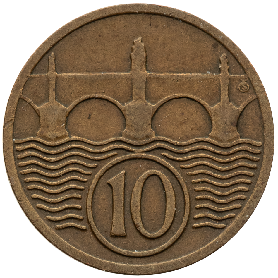 Reverz mince (rubová strana): Uprostřed nominální hodnota „10“ v oválném poli, pod stylizovaným mostem se třemi oblouky a nad vlnami vody.