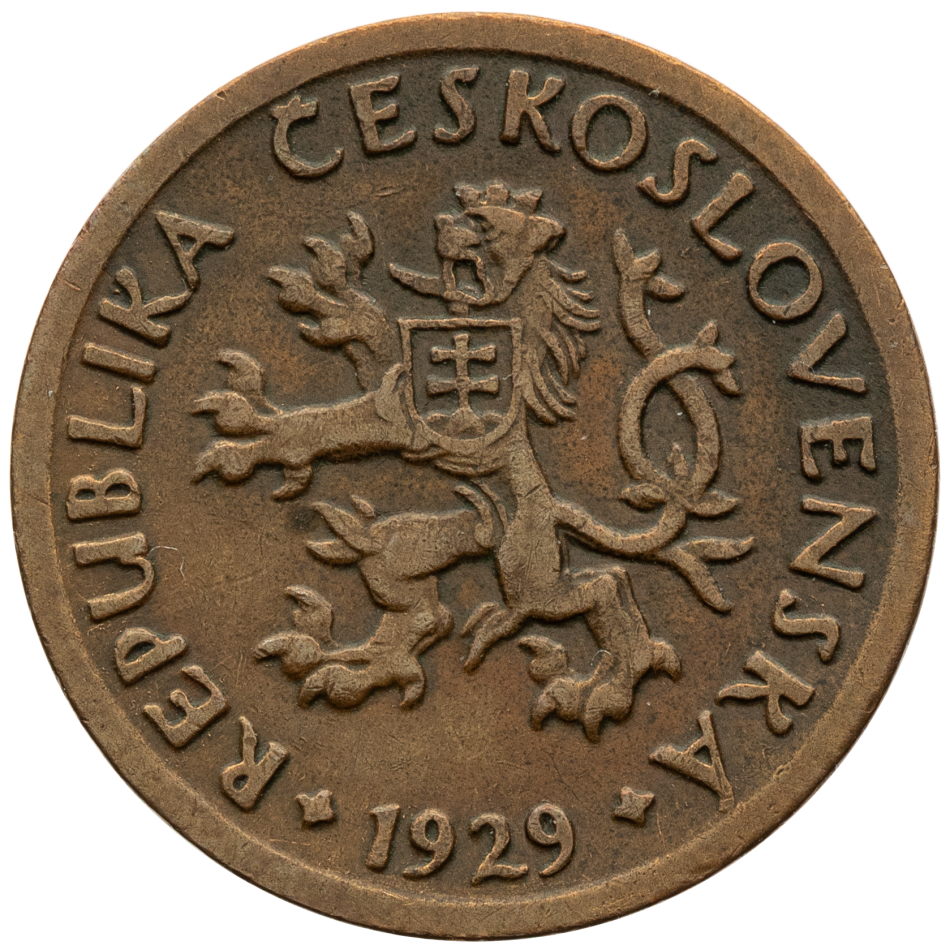 Averz mince (lícní strana): Český lev se dvěma ocasy s malým slovenským znakem na hrudi, kolem opis „REPUBLIKA ČESKOSLOVENSKÁ“ a dole letopočet „1929“.