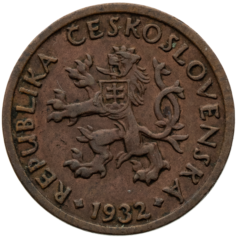 Averz mince (lícní strana): Český lev se dvěma ocasy s malým slovenským znakem na hrudi, kolem opis „REPUBLIKA ČESKOSLOVENSKÁ“ a dole letopočet „1932“.
