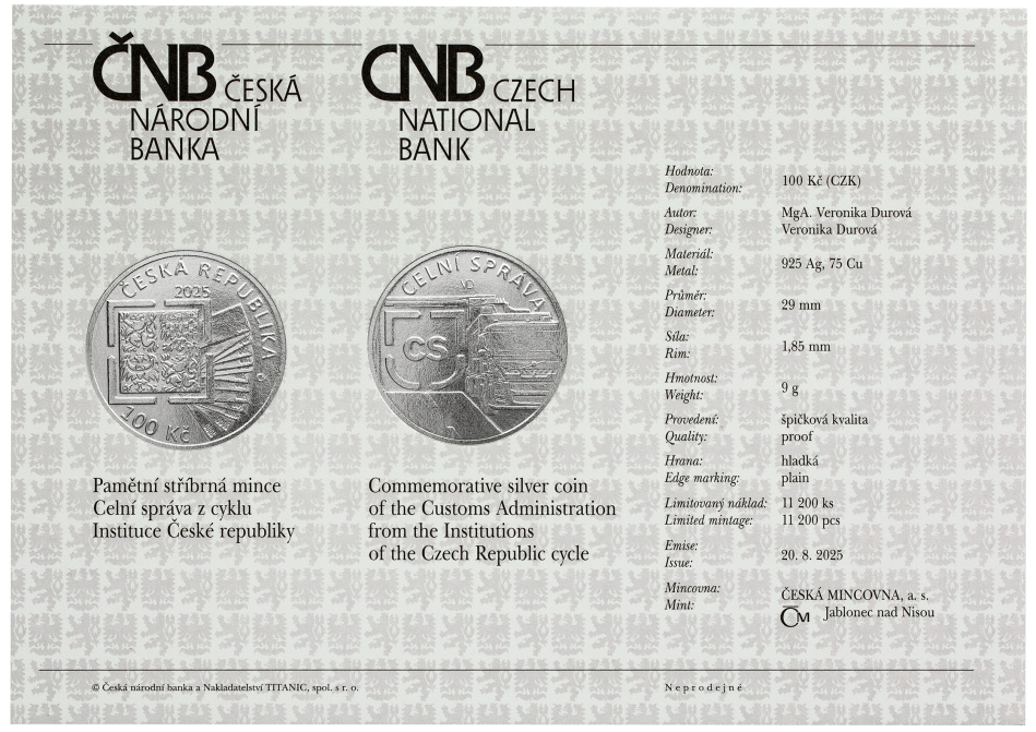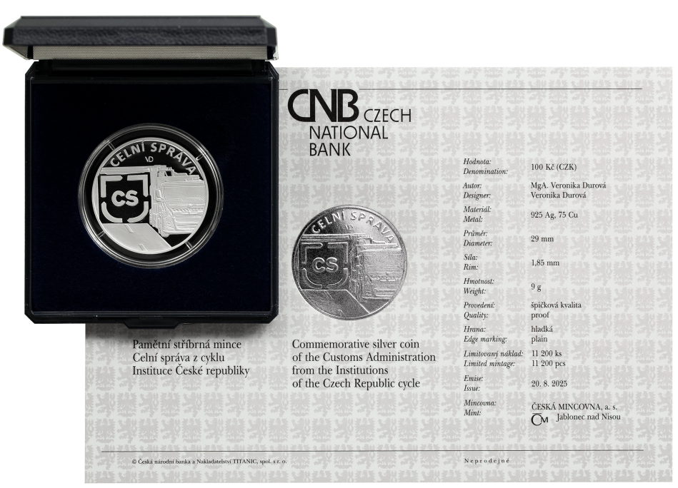 100 Kč Celní správa 2025 – stříbrná pamětní mince ČNB
