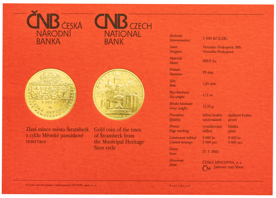 Pamětní zlatá mince České národní banky s nominální hodnotou 5 000 Kč, vydaná 27. května 2025 jako devátá mince ze série „c“ (2021–2025). Představuje historickou krásu malebného města Štramberk – často přezdívaného „Moravský Betlém“ díky své pohádkové architektuře a dominantě věže Trúba.